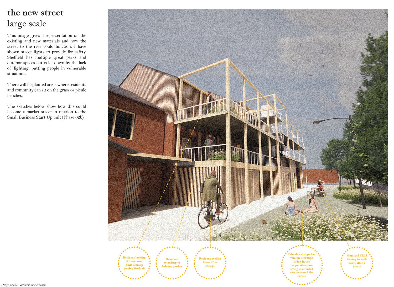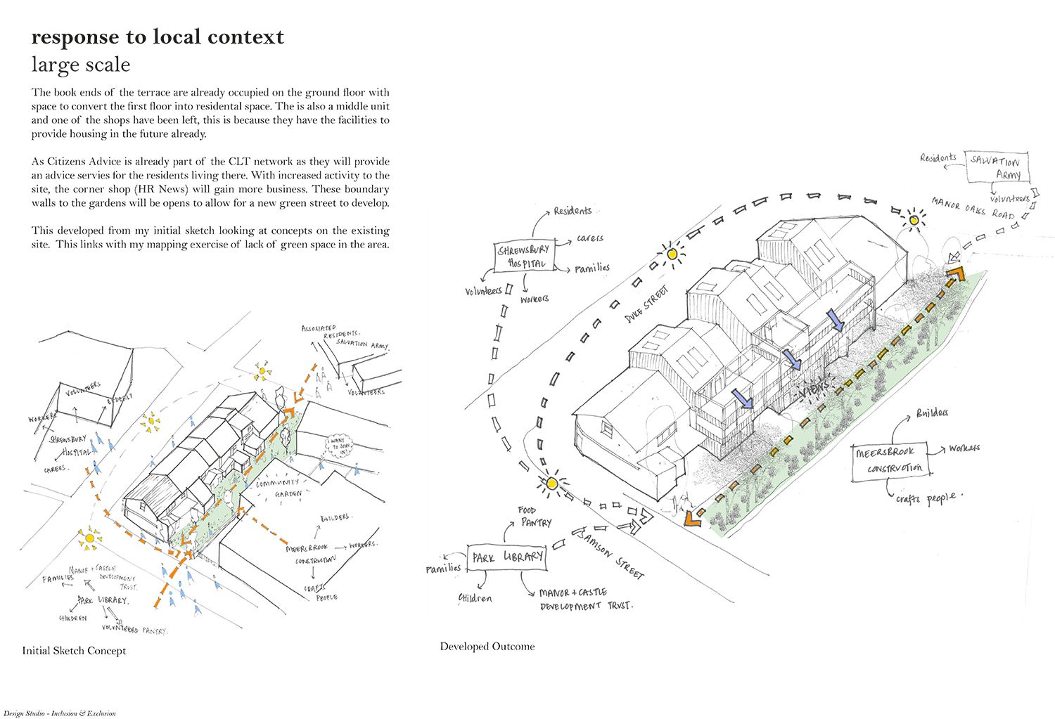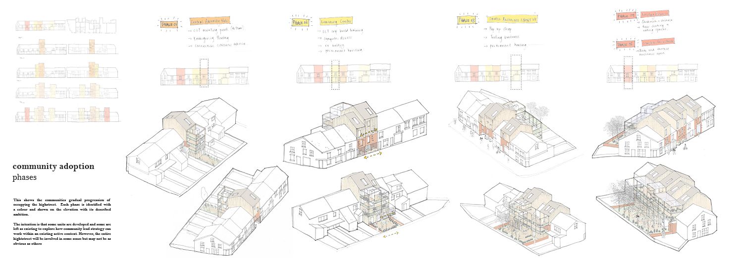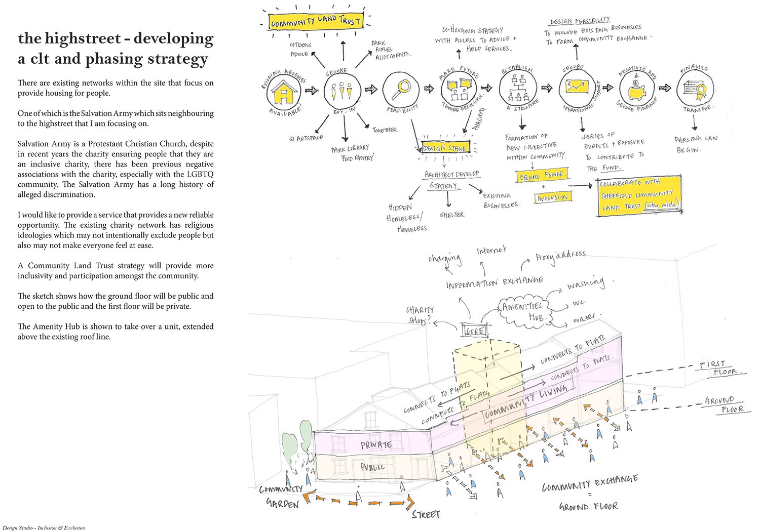 ‘In Community Land, We Trust’ was developed in response to the national housing crisis and number of homeless and hidden homeless people that require an alternative inclusive option for refuge. There is an increasing number of empty buildings in the country and this project provides an approach of how they could be occupied. I have explored an example of how the Sheffield CLT could be an umbrella for local groups working in specific postcodes. By creating an inclusive, caring and trusting network, developed knowledge can be transferred across the city for its residents to take ownership of their streets.
