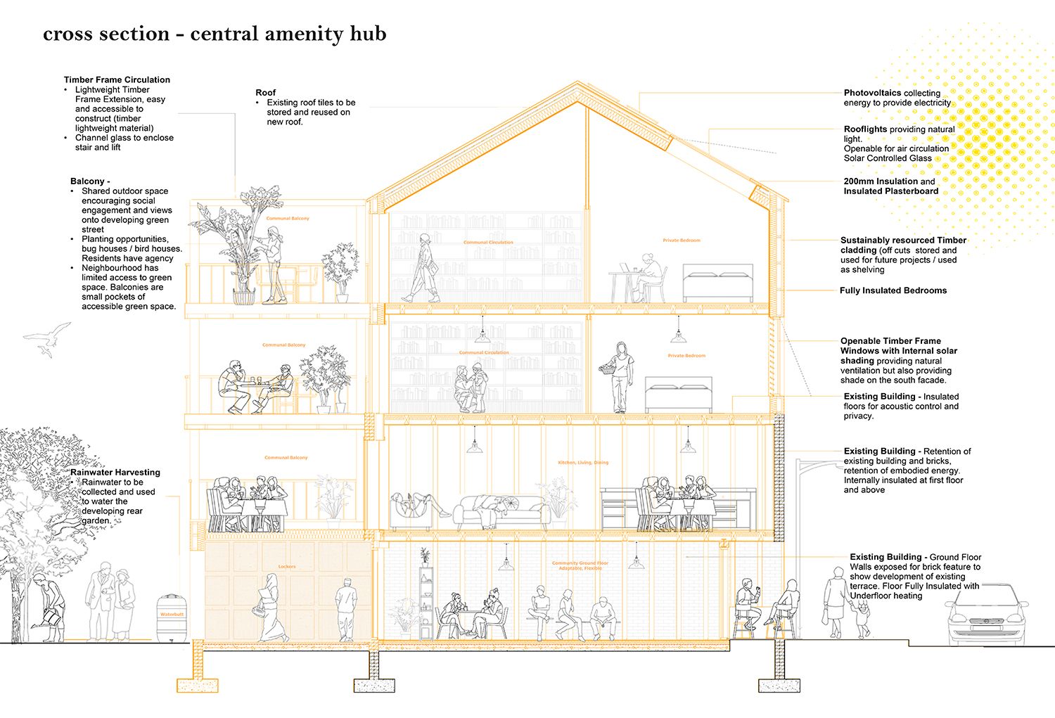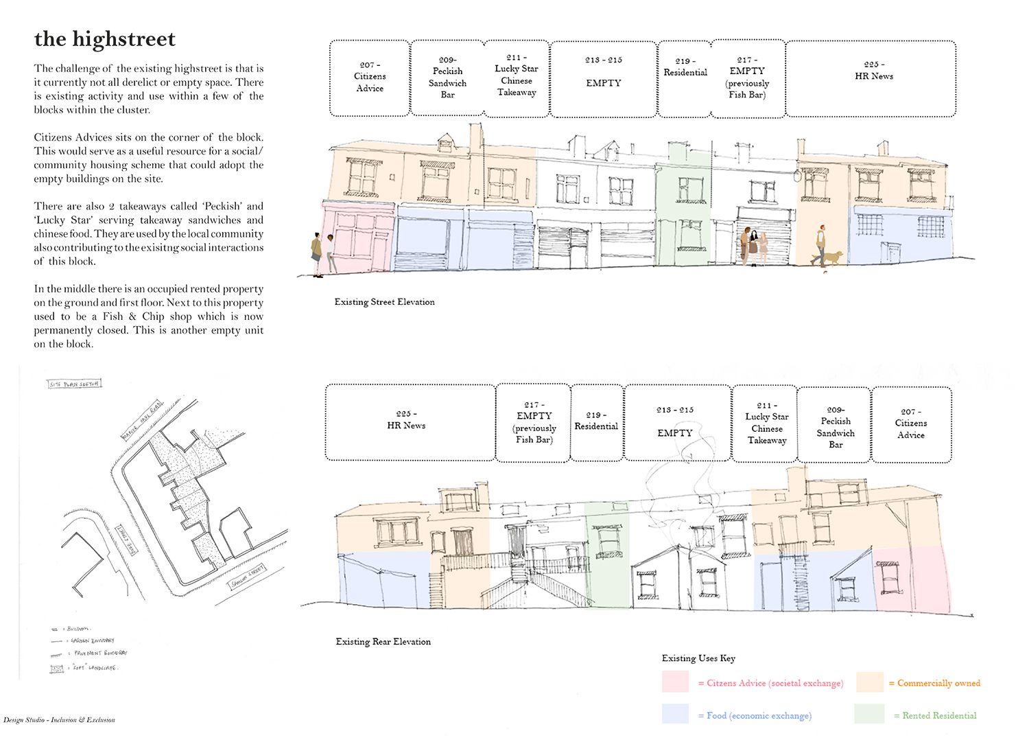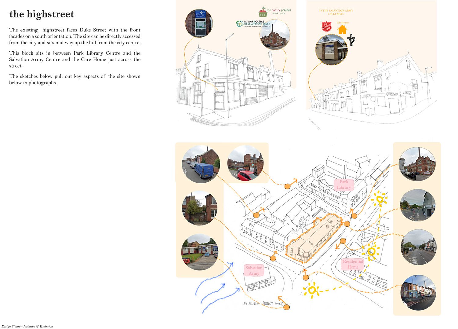 ‘In Community Land, We Trust’ was developed in response to the national housing crisis and number of homeless and hidden homeless people that require an alternative inclusive option for refuge. There is an increasing number of empty buildings in the country and this project provides an approach of how they could be occupied. I have explored an example of how the Sheffield CLT could be an umbrella for local groups working in specific postcodes. By creating an inclusive, caring and trusting network, developed knowledge can be transferred across the city for its residents to take ownership of their streets.