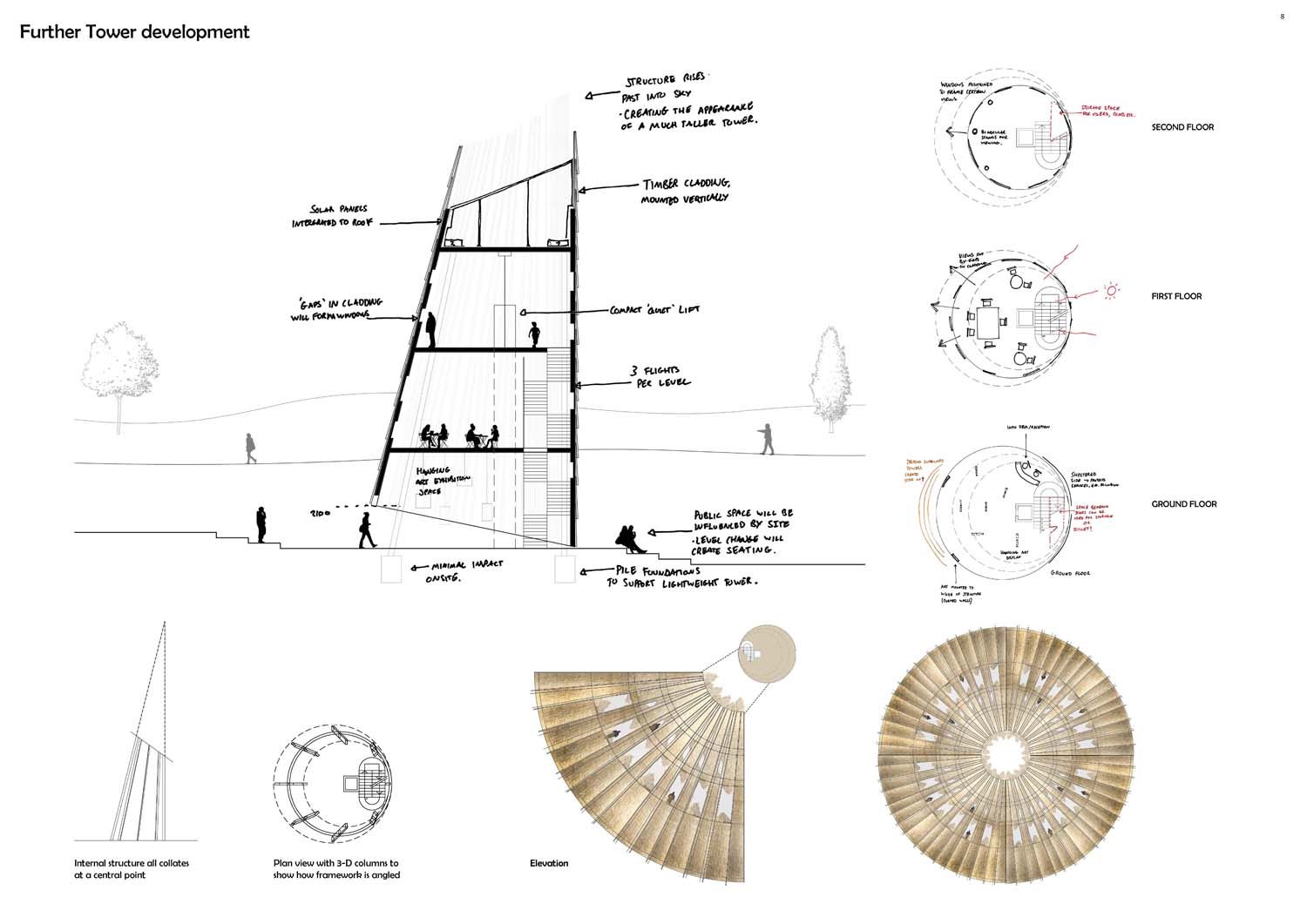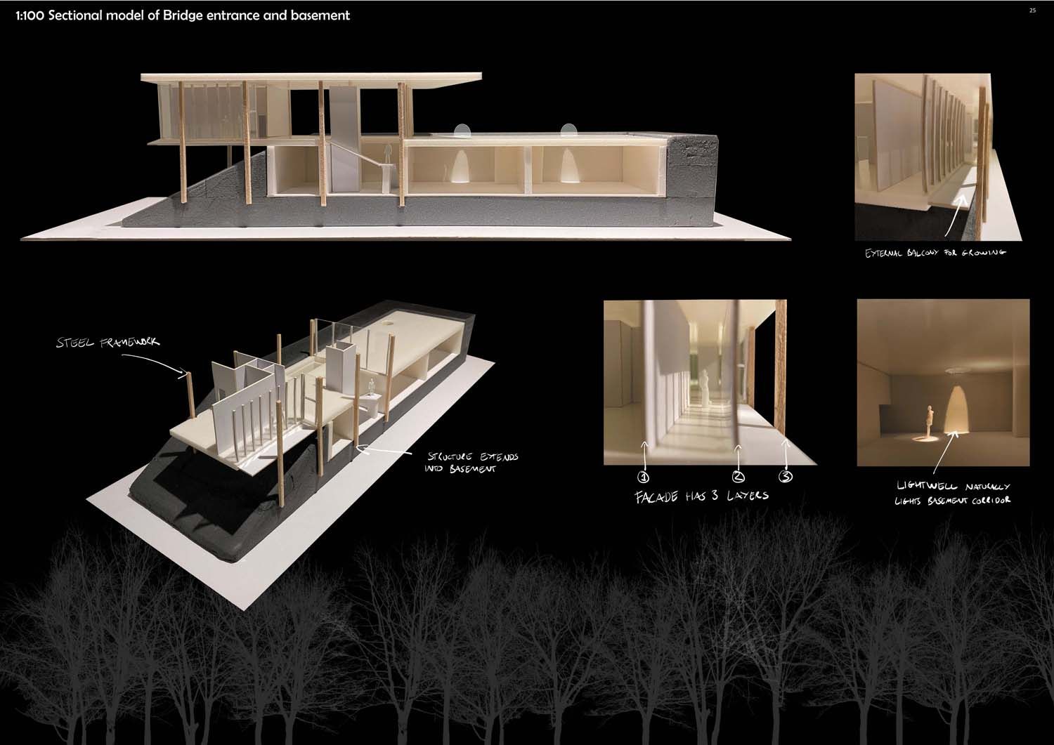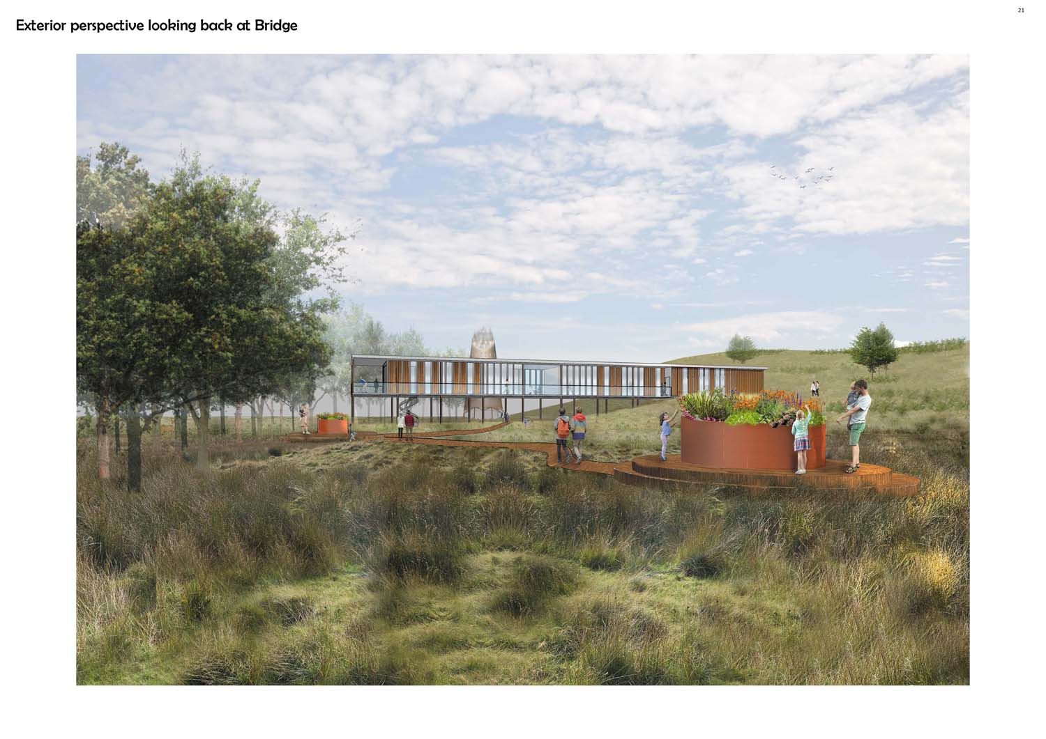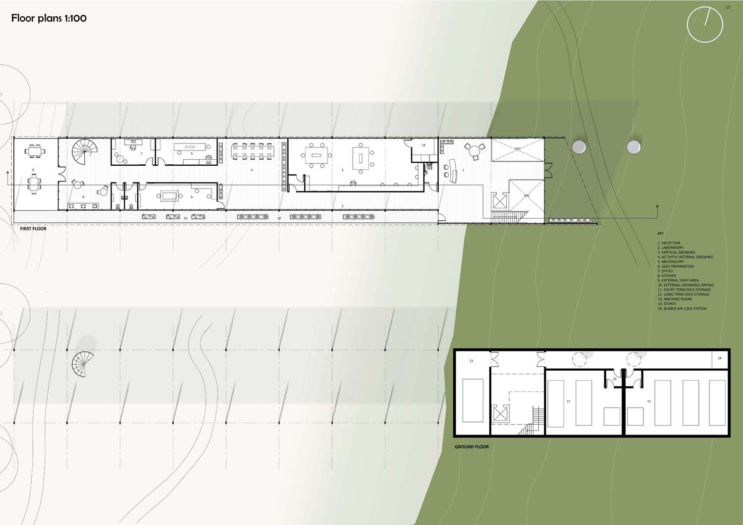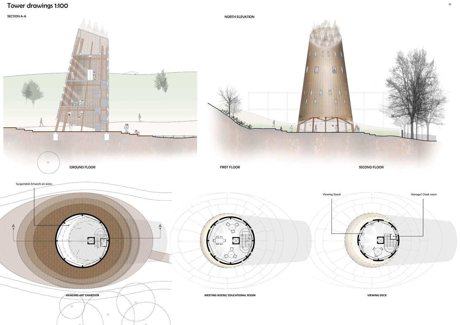 The project consists of two masses. The tower acts as an educational space, and provides views across the landscape. Whilst the Bridge connects various elements of the landscape together, storing seeds safely within the sloping terrain