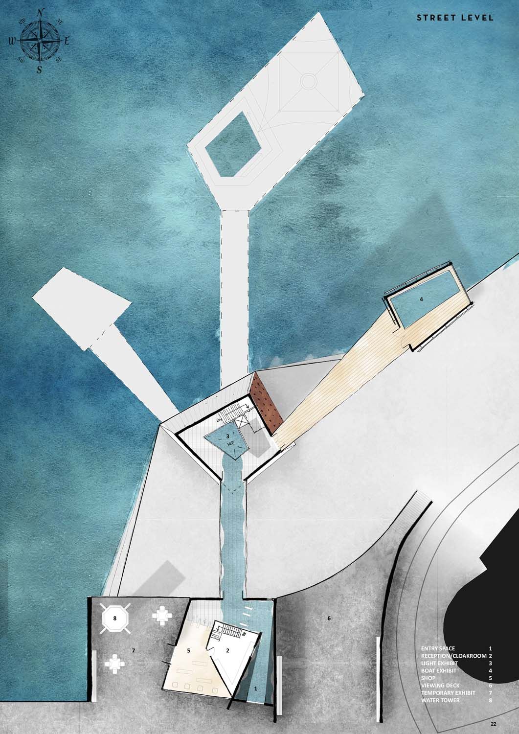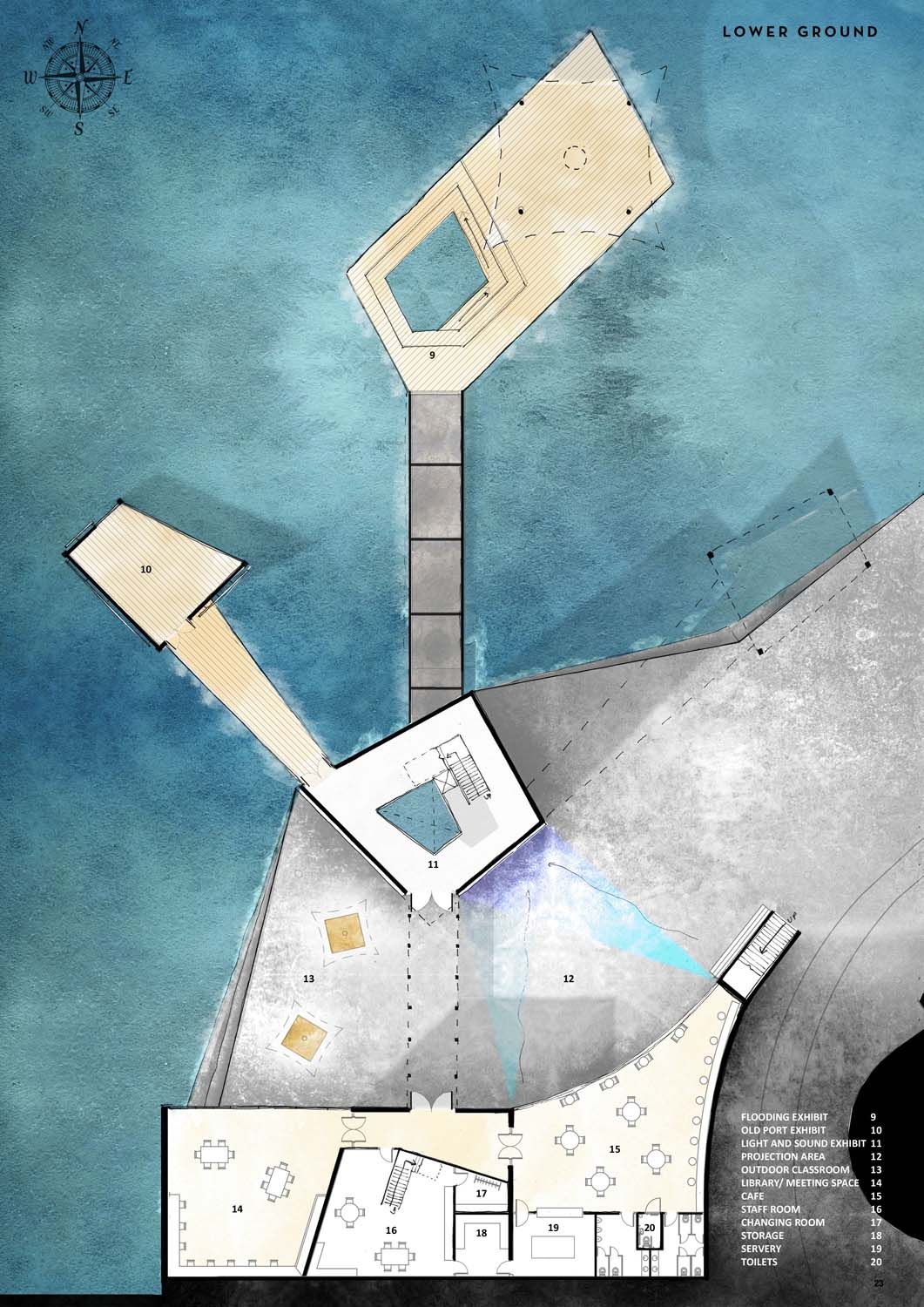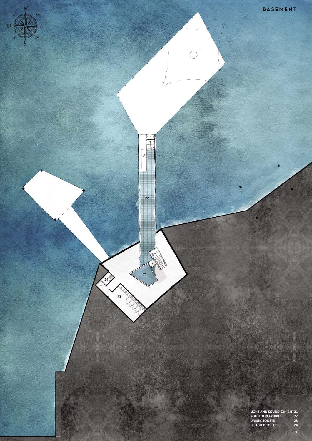 The design focuses on interior space, with the aim of creating dynamic environments through the use of voids and a flowing water exhibit.