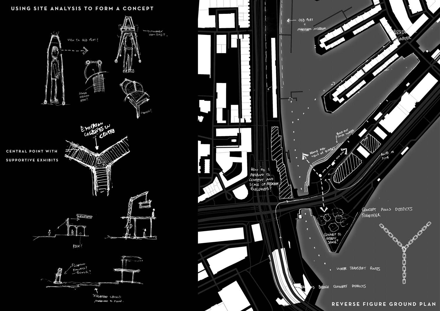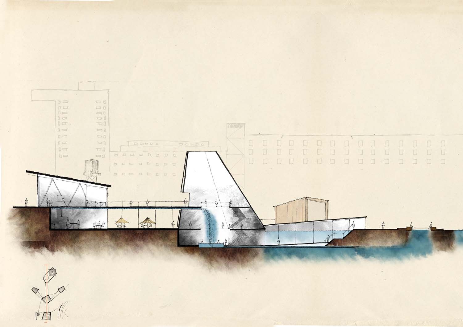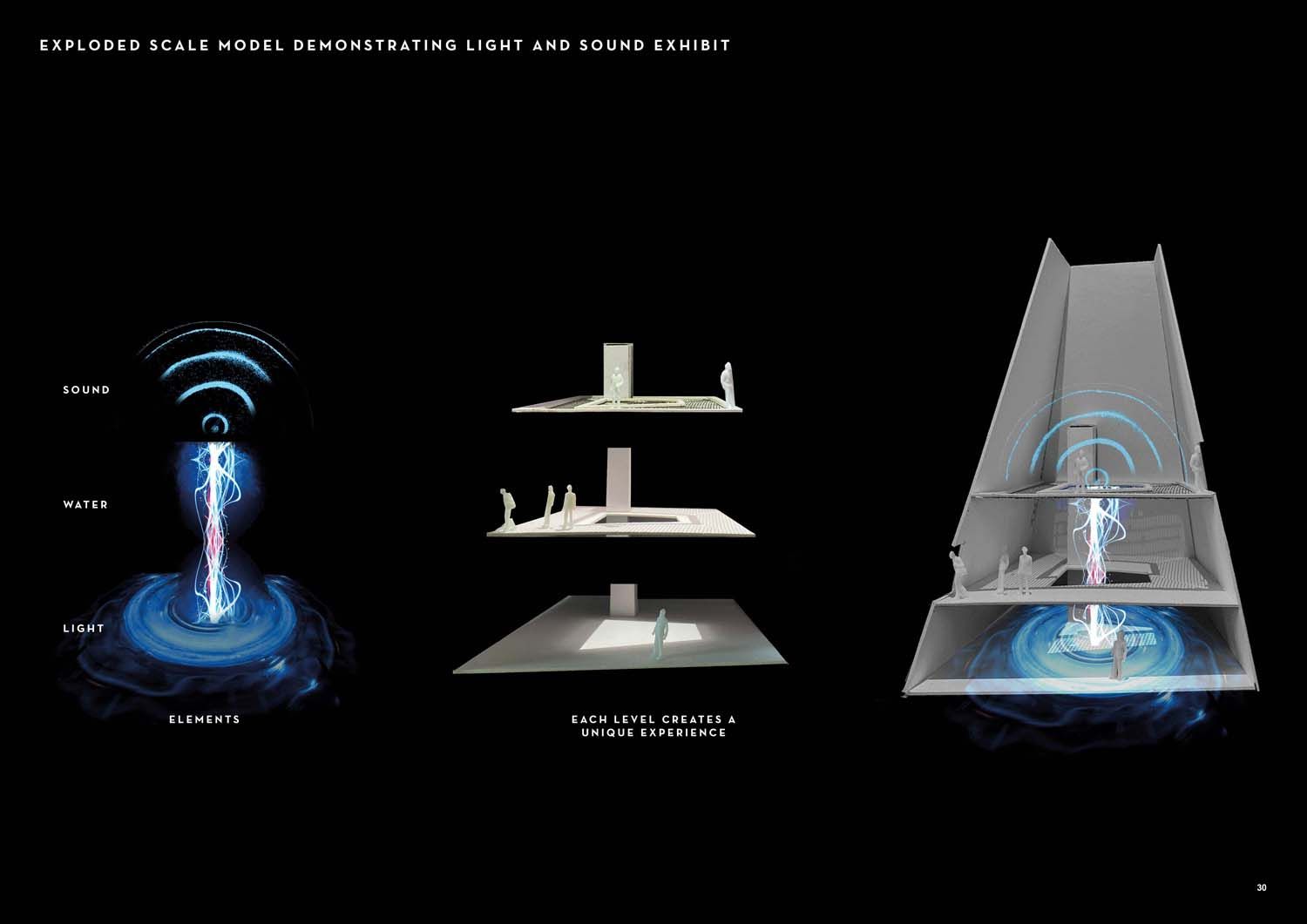 The design focuses on interior space, with the aim of creating dynamic environments through the use of voids and a flowing water exhibit.