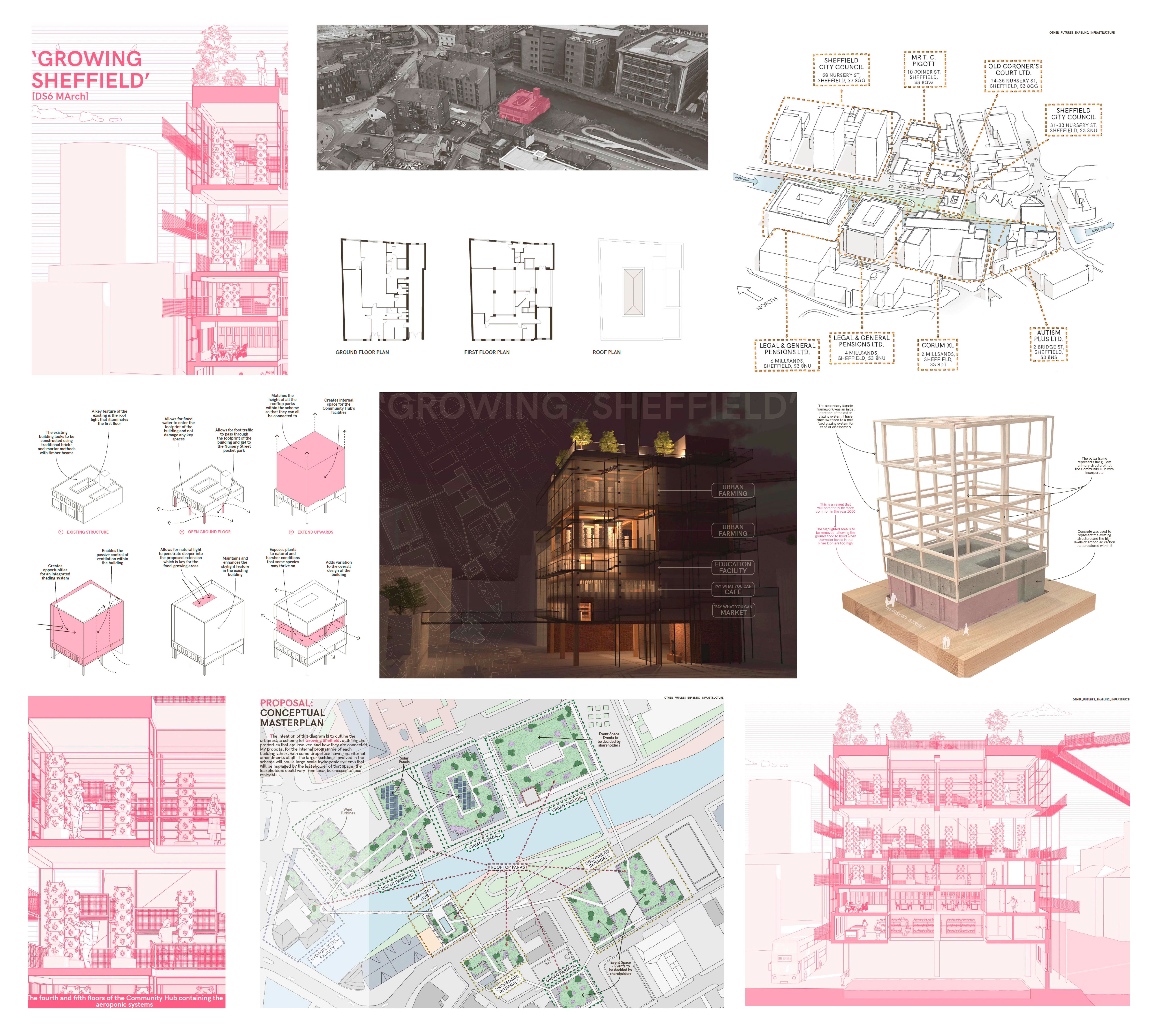 In 2050 Sheffield, the rise of VR technology and the Metaverse will minimise the need for the majority of office jobs; no longer will there be a need for face-to-face meetings. This scenario leaves corporate properties across the UK vacant and available for development. ‘Growing Sheffield’ aims to use these spaces for urban agriculture, bringing food production into cities and reducing the carbon footprint involved with transport costs in the food industry. ‘Growing Sheffield’ is a pioneering food-growing district in Sheffield that can be replicated further afield. A district that aims to bring people closer to the food production process whilst simultaneously reintroducing green space back into the city.
