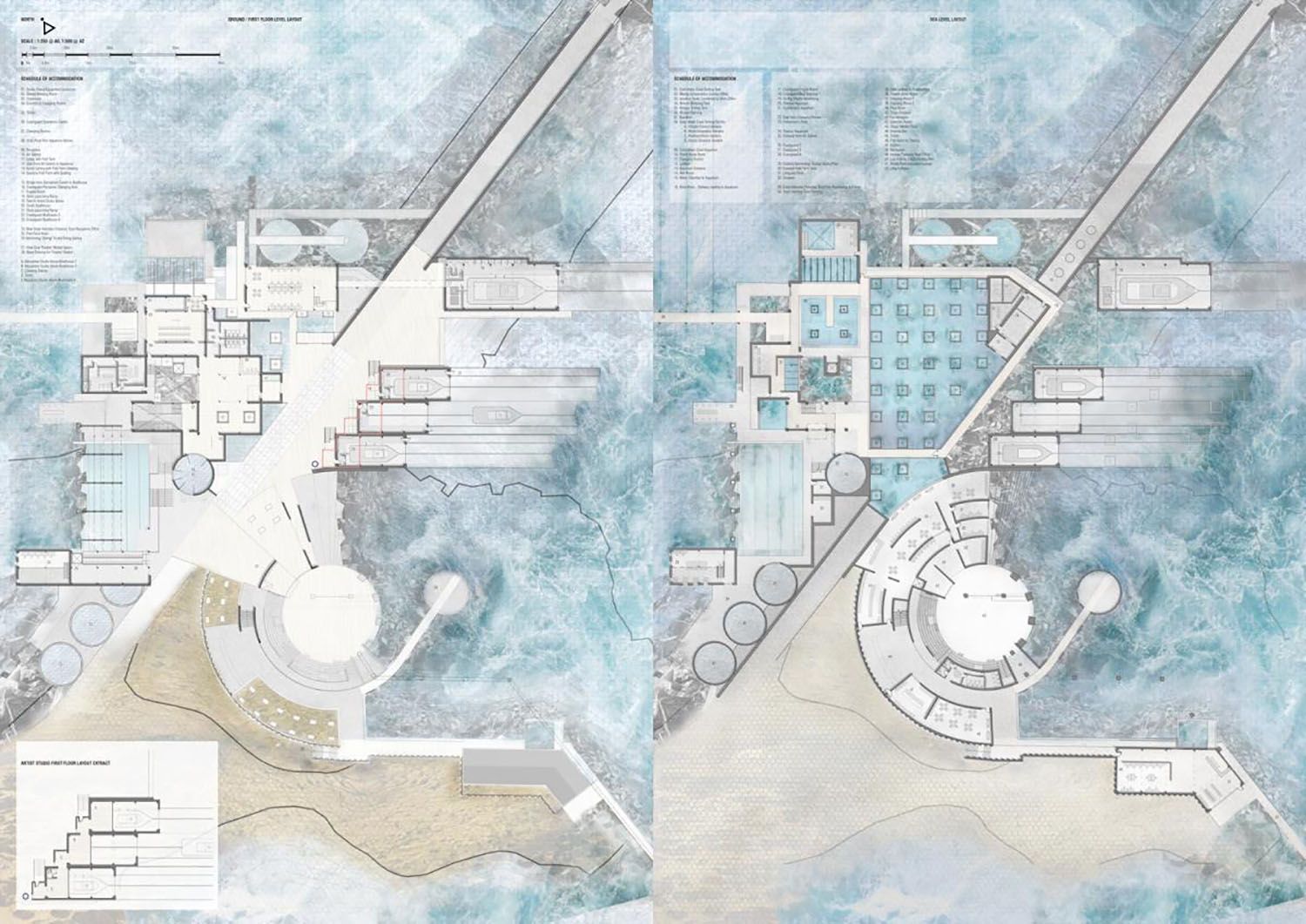 We know more about the moon than we do our own oceans. Climate change, overfishing and trawling techniques have had a devastating impact on benthic communities in the North East Atlantic. Liquid Assets looks at reimagining the UK oil and gas rig decommissioning process to help remedy the marine environment. The project stemmed from research of a strange phenomenon in the North Sea where cold water coral reefs have attached to oil and gas rigs. The project briefly indicates how substantial rig structures can be utilised as a marine/ fishing base, though the main focus looks at how funds from the decommissioning process can be reallocated to promote marine conservation in an urban area. The Breakwater Institute in Stornoway aims to attract people to the Island as well as connect in to the existing Hebridean society. Marine based actors and agents from the Marine Conservation Society, Outer Hebrides Fisheries Trust and local University helped direct the design brief. The landscraper architecture has been informed from both the local vernacular and boat building industry. This proposal goes on to highlight how organisations and actors will use the Breakwater Institute such as the marine biologist, islander (eileanach), tourist, coastguard and fisherman.