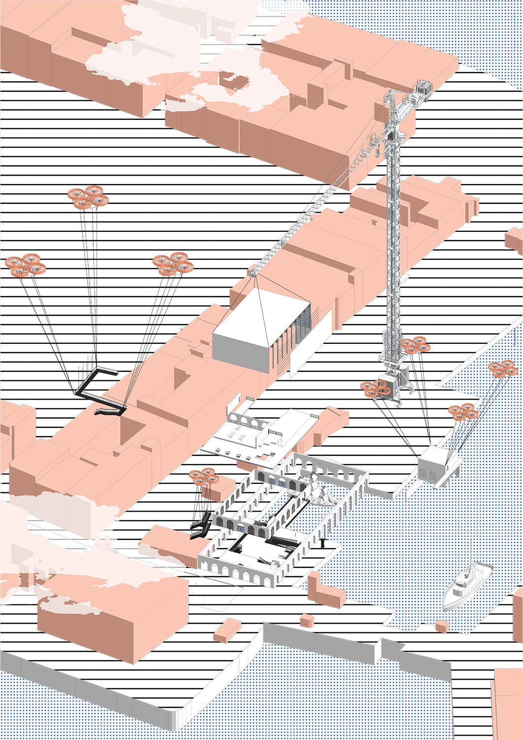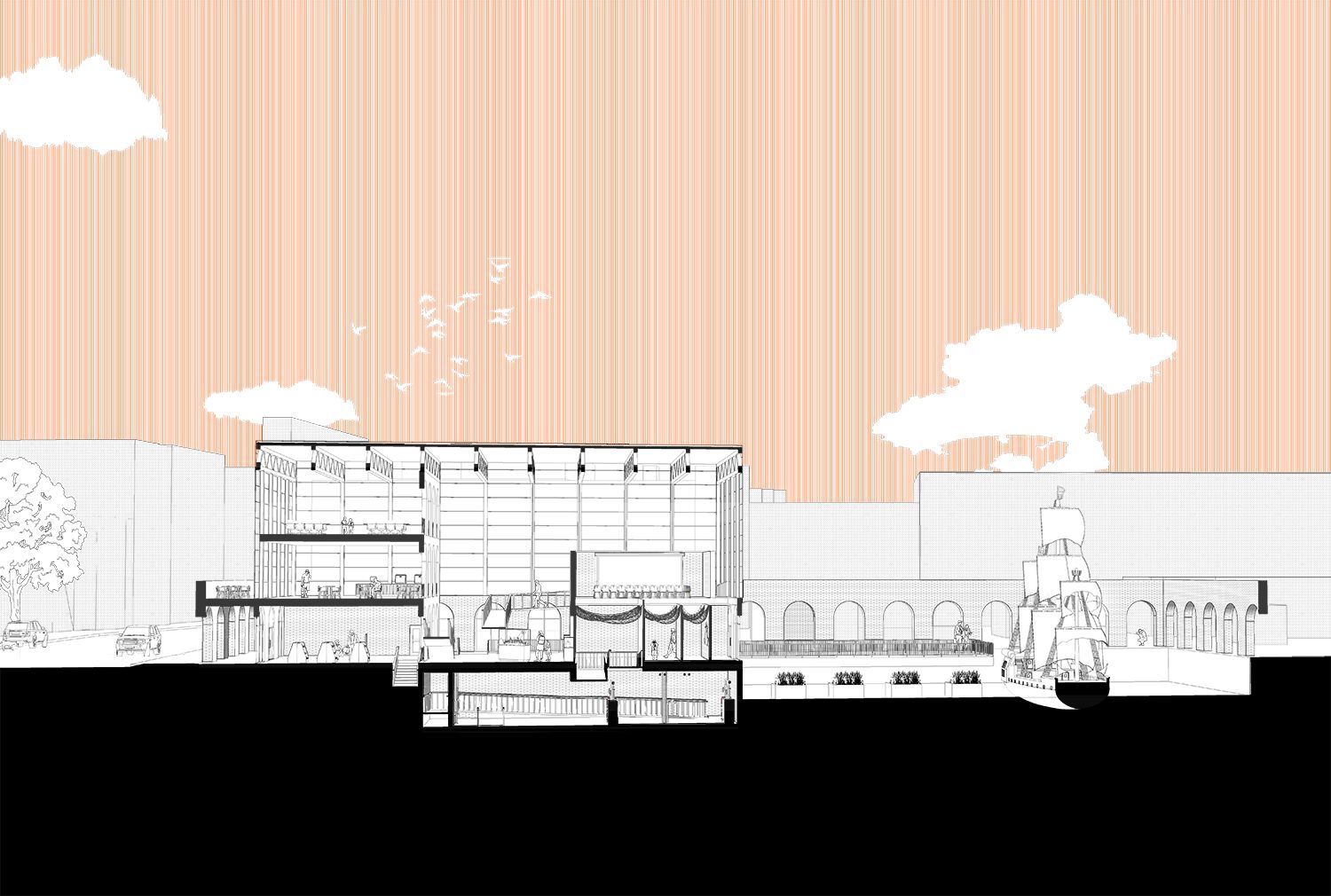 Another early, key concept was using tidal and rising sea level graphs to influence all vertical circulation. Tidal graphs related to fast vertical change (stairs & lifts) whereas the rising sea level graph relate to a slower more gradual vertical change (ramps).