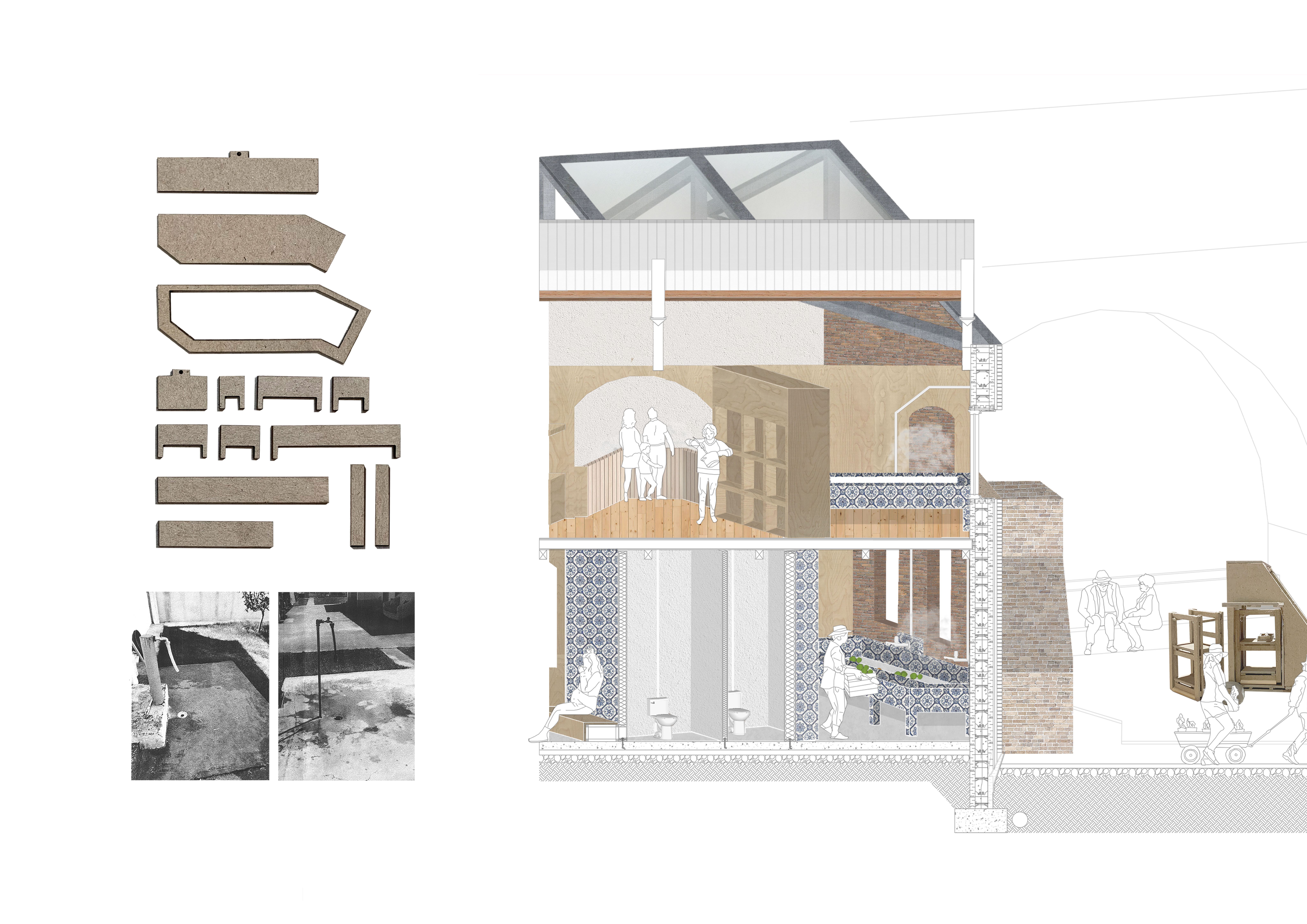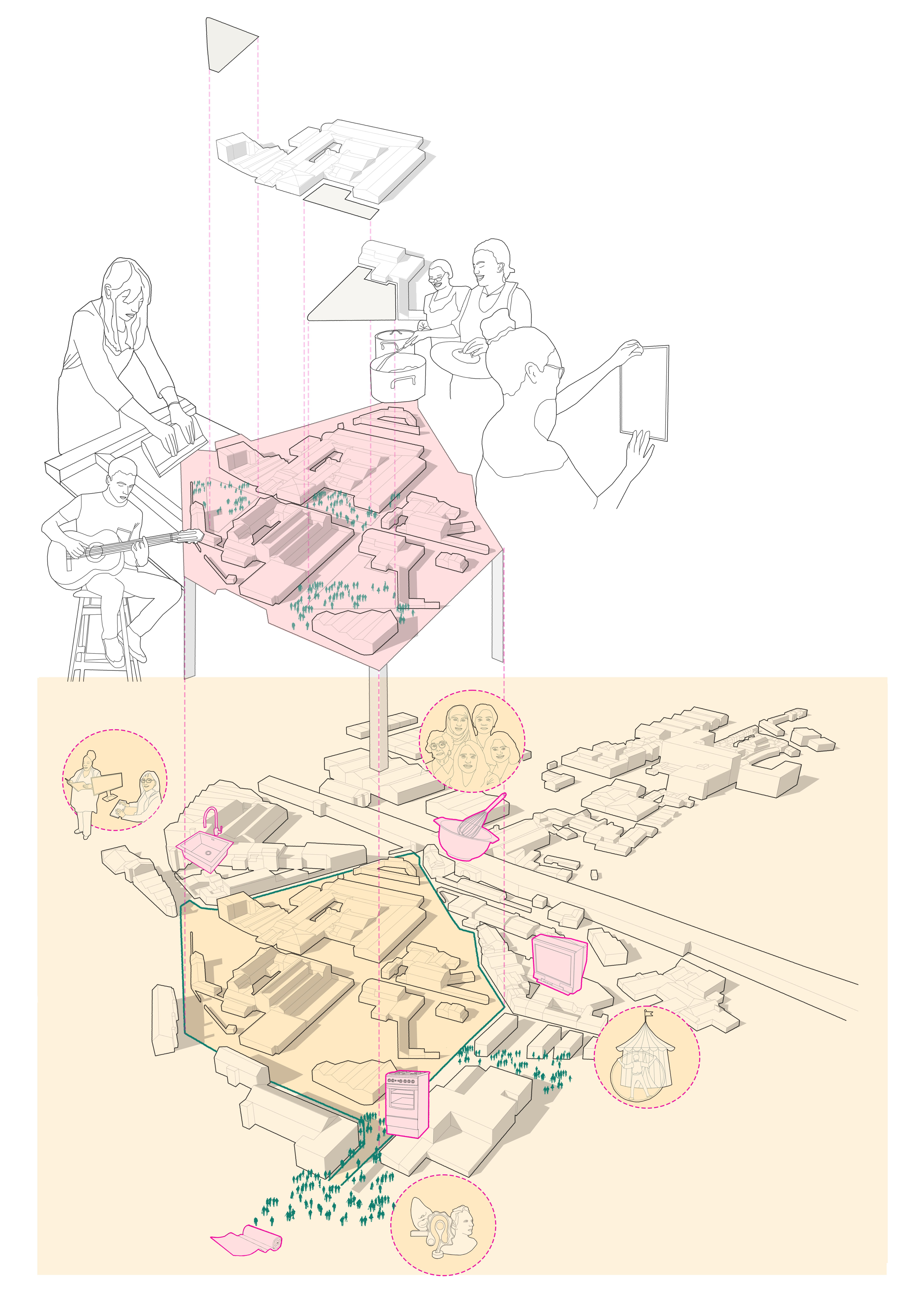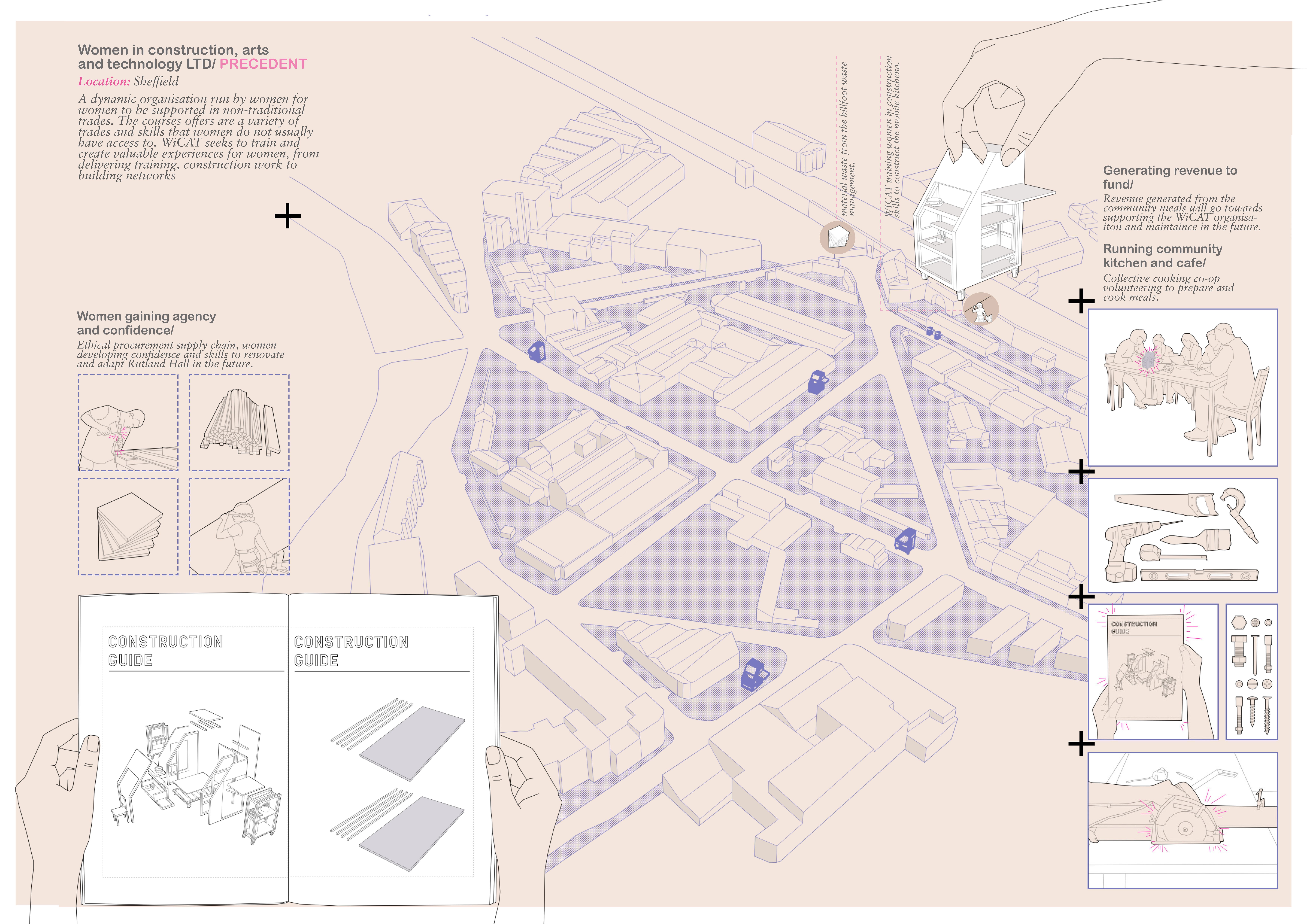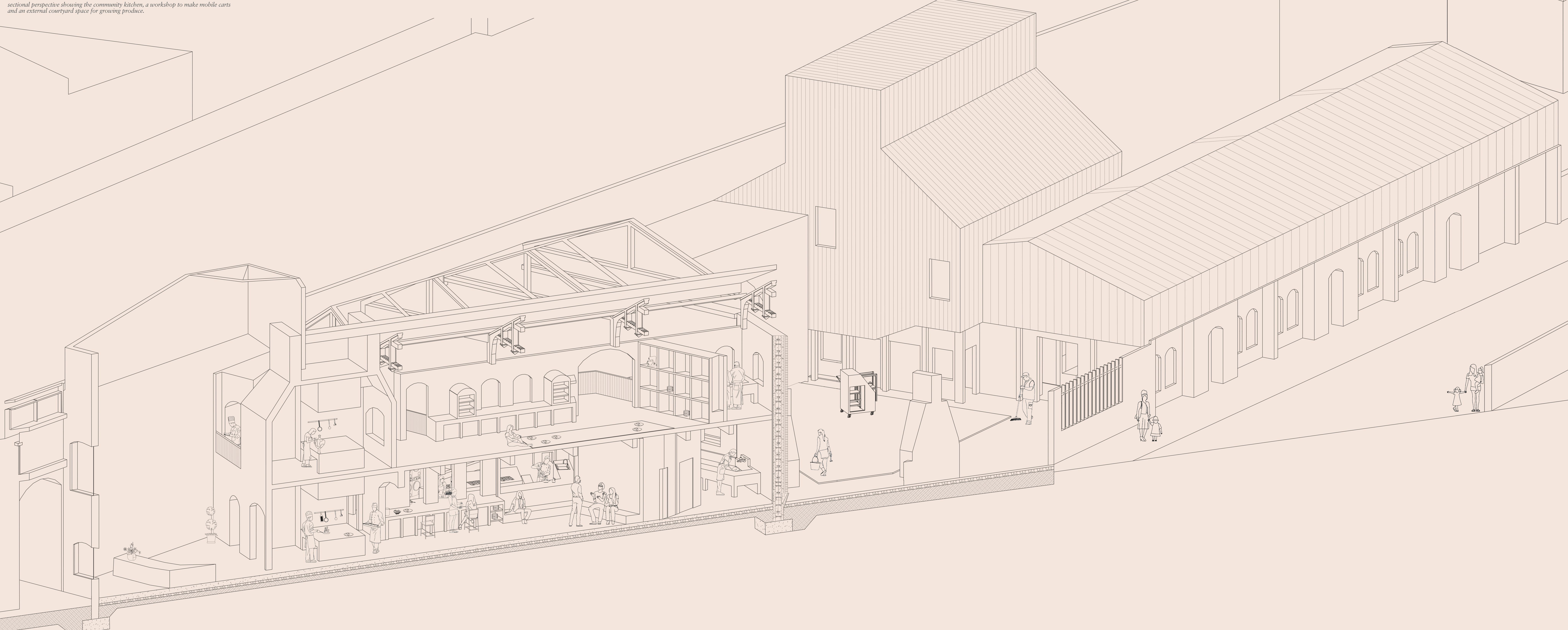 Cooking takes up so much of our daily routines, the time it takes to do grocery shopping, wash, prepare, eat food, and wash up after is a part of every person’s daily activity. Many feminist thinkers throughout history have critiqued models of the kitchen and its standardisation as a way of regulating household labour. The Domestic City aims to create a network of the generative aspects of the kitchen and bring to the forefront alternative forms of exchange systems and care. Spaces reminiscent of preparing, washing, cooking, and eating food are taken from the kitchen and dispersed into the urban environment producing alternative economies. Once we begin to remove the kitchen from the home and disperse it into the urban environment, we can make visible the power structures of those who are cared for.